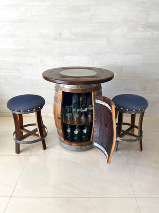 Oak Barrel Pub Table Set, Counter Height Wood Glass Top, Cabinet Storage, Bar Stools, Home Bar, Man Cave - Handmade from Family Business