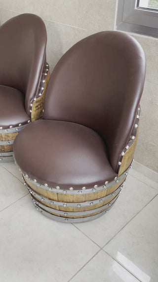 Brown Oak Barrel Chair, Handmade Wine and Whiskey Barrel Chair, Hidden Storage, Memory Foam Upholstery, Movable On Casters